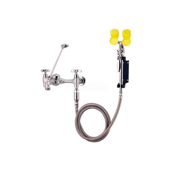 Speakman eyesaver service sink faucet with fixed mount eyewash, sef-9000-fm, chrome & yellow speakman eyesaver combination eyewashes and service sink faucet are a revolutionary exclusive speakman product with a unique design that combines a eyewash/drench hose and a speakman service sink faucet. The eyewash is attached directly to the faucet's cold water integral stop cavity and permits both units to operate independently. As a result only one plumbing connection is required and there is never a worry about delivering scalding water to the eyes. The unique design is equally beneficial for new installations as well as retrofits. The sef-9000-fm is a rough chrome plated service sink faucet and eyewash with twin spray outlets with flip-top dust covers. The sef-9000-fm is compliant to the ansi z358.1 standard and is fm certified. features: eyewash/drench hose attaches directly to faucet's cold water integral stop cavity eyewash/drench hose & faucet operate independently requires only one plumbed connection fixed mount eyewash/drench hose configuration meets ansi z358.1