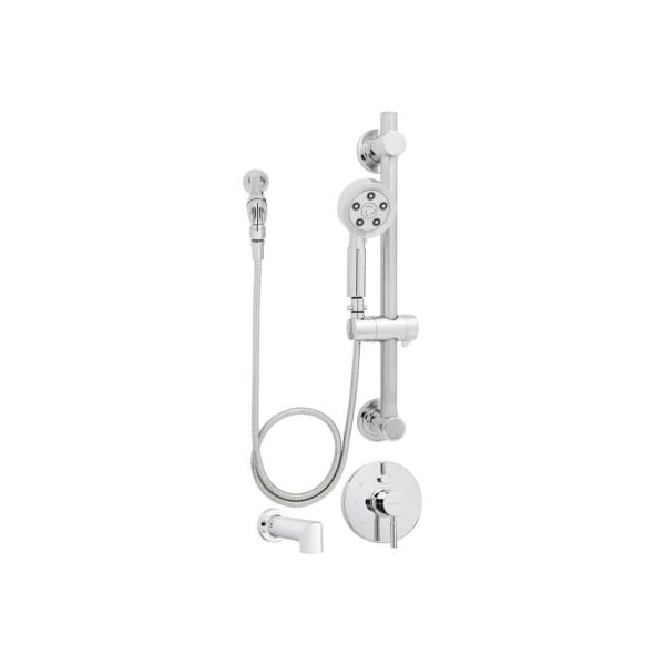 Speakman sm-1490-ada-p neo ada handheld shower/tub combinations w/grab/slide bar encompassing bold style and practicality in one wall mounted shower system, the neo ada slide bar, hand shower and tub package builds on speakman's legacy of hotel shower fixtures. The neo hand shower, solid brass shower arm and flange, anti-scald pressure balance shower valve with diverter, tub spout, and ada grab bar combine to complete a shower system that is safe, functional, and stylish. Showcasing patented anystream 360 technology, the hand shower allows the user to easily transition through 360 of full-flood needling spray, center pulsating massage, or a combination of both with a simple rotation of the showerhead's faceplate. An ada compliant pause/trickle adapter connects the base of the hand shower to the shower hose, which permits the water source to be turned on or off for ease of operation for those with physical handicaps. The durable 60 inch metal shower hose and ada grab bar add functionality and extra support while allowing the shower head height to be adjusted up or down. An anti-scald pressure balance shower valve maintains a consistent water temperature while in use. Ada-compliant shower systems offer several advantages for those with disabilities, including sturdy support and ease of operation. This luxury shower system can be paired with any of speakman's neo bathroom sink faucets and fixture accessories sets for a modern, customized look. features: neo hand shower with anystream 360 degree spray adjusting face plate durable 60 inch metal shower hose with integrated vacuum breaker, ada pause/trickle adapter neo solid brass shower arm and flange ada compliant slide bar/grab bar neo anti-scald pressure balance valve and trim neo modern tub spout with diverter