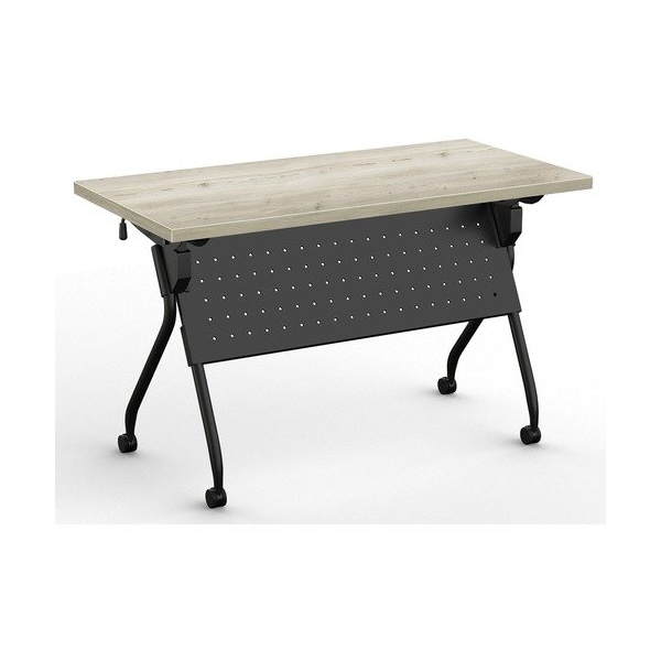 Stylish, lightweight and easy to use, the Transform-2 Flip and Nest Table provides a versatile solution to any training room and classroom environment. Contemporary base offers straight-on nesting in flip-top application that saves room in tight spaces. Each additional table takes up to 7-1/2in in the flipped position. Its lightweight material, casters and one-handed activation allow anyone to flip and move tables with ease. Flip latch allows one-handed activation on both sides. Perforated steel modesty panel extends 14in below the tabletop and is an integral part of the base, providing privacy and an elegant look at the same time. Continuous, heavy-duty beam prevents top from sagging. Stretcher bar spans between the legs and provides additional stability. Tabletop features high-pressure, patterned laminate. Cord management is easy with the J-shape wire manager and table-leg wire channel. Locking, 2-1/4in dual-wheel black casters on the silver base hold up to 112 lb.