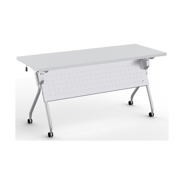 Stylish, lightweight and easy to use, the Transform-2 Flip and Nest Table provides a versatile solution to any training room and classroom environment. Contemporary base offers straight-on nesting in flip-top application that saves room in tight spaces. Each additional table takes up to 7-1/2in in the flipped position. Its lightweight material, casters and one-handed activation allow anyone to flip and move tables with ease. Flip latch allows one-handed activation on both sides. Perforated steel modesty panel extends 14in below the tabletop and is an integral part of the base, providing privacy and an elegant look at the same time. Continuous, heavy-duty beam prevents top from sagging. Stretcher bar spans between the legs and provides additional stability. Tabletop features high-pressure, patterned laminate. Cord management is easy with the J-shape wire manager and table-leg wire channel. Locking, 2-1/4in dual-wheel black casters on the silver base hold up to 112 lb.