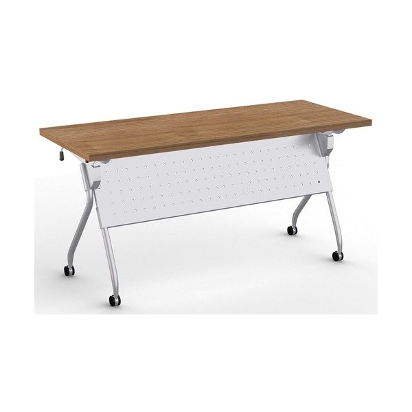 Stylish, lightweight and easy to use, the Transform-2 Flip and Nest Table provides a versatile solution to any training room and classroom environment. Contemporary base offers straight-on nesting in flip-top application that saves room in tight spaces. Each additional table takes up to 7-1/2in in the flipped position. Its lightweight material, casters and one-handed activation allow anyone to flip and move tables with ease. Flip latch allows one-handed activation on both sides. Perforated steel modesty panel extends 14in below the tabletop and is an integral part of the base, providing privacy and an elegant look at the same time. Continuous, heavy-duty beam prevents top from sagging. Stretcher bar spans between the legs and provides additional stability. Tabletop features high-pressure, patterned laminate. Cord management is easy with the J-shape wire manager and table-leg wire channel. Locking, 2-1/4in dual-wheel black casters on the silver base hold up to 112 lb.