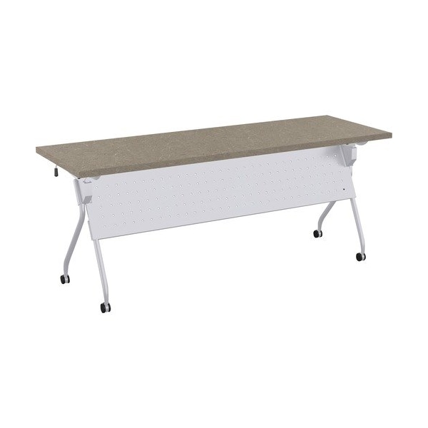 Stylish, lightweight and easy to use, the Transform-2 Flip and Nest Table provides a versatile solution to any training room and classroom environment. Contemporary base offers straight-on nesting in flip-top application that saves room in tight spaces. Each additional table takes up to 7-1/2in in the flipped position. Its lightweight material, casters and one-handed activation allow anyone to flip and move tables with ease. Flip latch allows one-handed activation on both sides. Perforated steel modesty panel extends 14in below the tabletop and is an integral part of the base, providing privacy and an elegant look at the same time. Continuous, heavy-duty beam prevents top from sagging. Stretcher bar spans between the legs and provides additional stability. Tabletop features high-pressure, patterned laminate. Cord management is easy with the J-shape wire manager and table-leg wire channel. Locking, 2-1/4in dual-wheel black casters on the silver base hold up to 112 lb.