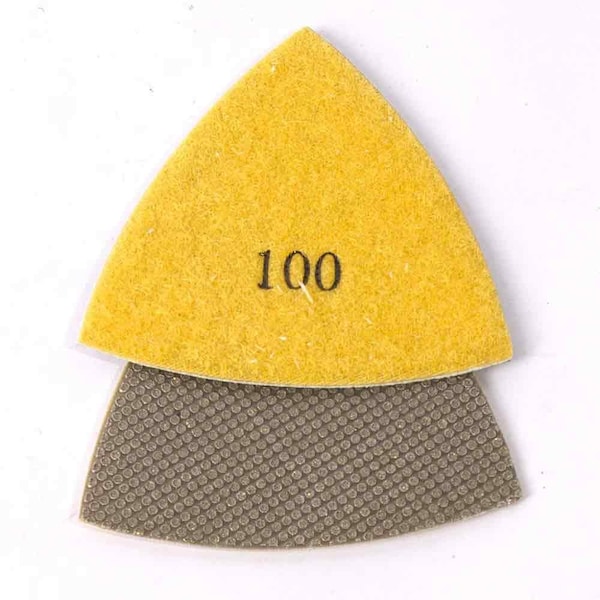 Specialty Diamond MB1S 100 Grit Electroplated Triangular Polishing Diamond Pads for Oscillating Tools. Diamond abrasive pads are the perfect solution for grinding and polishing hard materials. Manufactured using electroplated diamond technology, this 100 grit diamond pad is the first steep when polishing glass, granite and natural stone, concrete, ceramic and other hard material. Use the 100 grit pad following the 50 grit pad as the first step in the polishing process, the 100 grit pad will remove heavy marks left by the 50 grit diamond pad as well as prepare the surface for the 200 grit diamond pad.Ideal for smoothing sharp corners and edges in stained glass projects, polishing edges on natural stone tile and polishing lapidary rock specimens. Use the 100 grit pad for polishing concrete and terrazzo floors in hard to reach areas such as corners and stairs. Hardin diamond abrasive pads will attach to any triangular hook and loop oscillating pad.