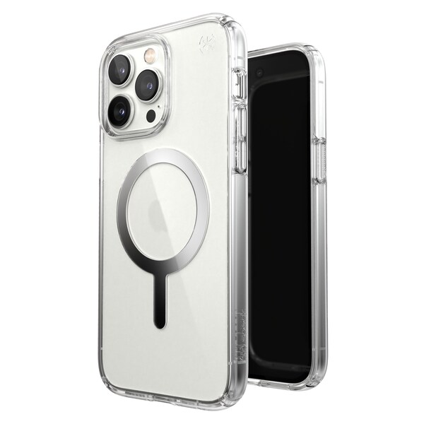 Speck PRESIDIO PERFECT-CLEAR MAGSAFE Case PRESIDIO PERFECT-CLEAR MAGSAFE case is the clearest, super-protective, pocket-friendly case. Highly protective, yet slim, this case is pocket-friendly, and is built with precision magnets that work reliably with all Apple MagSafe chargers and accessories. Real-world tested to withstand drops up to 13 feet. It also has Microban antimicrobial product protection that delivers up to a 99% reduction in stain and odor-causing bacteria on the case, creating a cleaner surface. Product Features: Up to 13-foot drop protection for extreme durability Dual layer perimeter protection: Hard PC disperses / Soft TPU absorbs Perfect-Clear coating resists discoloration, scratching Anti-yellowing materials keep your case looking perfectly clear Designed with precise magnets that work reliably with all Apple MagSafe accessories Microban antimicrobial product protection reduces bacteria growth up to 99% Raised full 360-degree bezel protects the screen Raised camera ring protects camera lenses