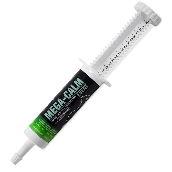 Mega-Calm Event is a unique proprietary formula consisting of Mega-Calm powder in a paste form coupled with the added benefit of Stress Guard, a blend of key ingredients to support stress relief on the day of the event. One ingredient in Stress Guard is Cortabate, a proprietary branded ingredient backed by 10 clinical trials, including confirmation of its ability to reduce the stress hormone cortisol. Horse owners and trainers use the convenient multi-serving syringe while traveling or days that high stress is anticipated.Function FactsCalming - L-Tryptophan, Vitamin E, Thiamine (B1)-Muscle Relax - Magnesium Fatigue Recovery - Thiamine (B1)Cortisol Reduction, Focus, Pain Reduction, Joint Support, Cardiovascular health, Enhanced energy and ATP - CortabateStress Relief - Cortabate, MagnesiumDirections:1,000 lb horse weight - Feed 40cc (1/2 syringe) 2 hours prior to the event. 500 lb horse weight - feed 20cc 2 hours prior to the event.Expect Results:Within 1 to 2 hours.