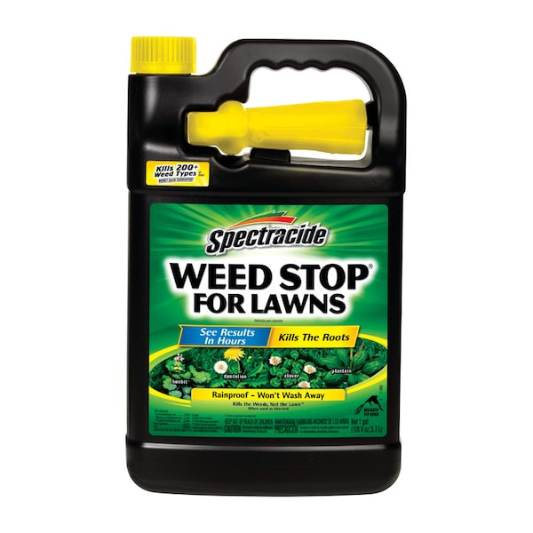 Spectracide Weed Stop For Lawns Concentrate kills more than 200 types of weeds as listed and it won't harm your lawn when used as directed. This concentrated formula kills down to the root, with overnight results. Our easy-to-use, fast-acting insect, lawn disease and weed control solutions help you tame lawn and landscape invaders with incredible pest-punishing power. For best results, mow before treating weeds with Spectracide Weed Stop For Lawns Concentrate. Spray in spring when weeds are small and growing or in fall when many problem weeds germinate - treating in fall will eliminate many of next year's weeds. If certain tough weeds are not dead within 3 weeks, repeat spot treatment.