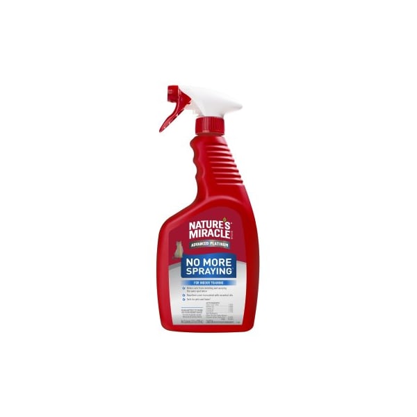Natures Miracle 24 OZ Platinum no more spraying stain & order remover stain & odor removing formula permanently eliminates all stain & odors. All natural cat repellents prevent cats from marking & revisiting the same spot twice.