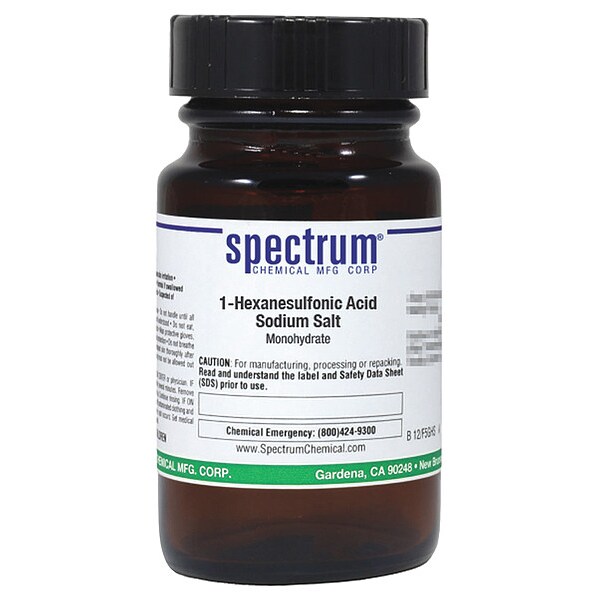 1-Hexanesulfonic Acid Sodium Salt, Monohydrate, CAS Number 207300-91-2, Molecular Weight 206.23, Chemical Formula C6H14O3SNa x H2O, Chemical Container Material Amber Glass, Chemical Container Type Bottle, Chemical Grade Lab, Chemical Container Size 25 g, Shelf Life 24 mo, Shipping Restrictions Chemical Not Regulated For Transport