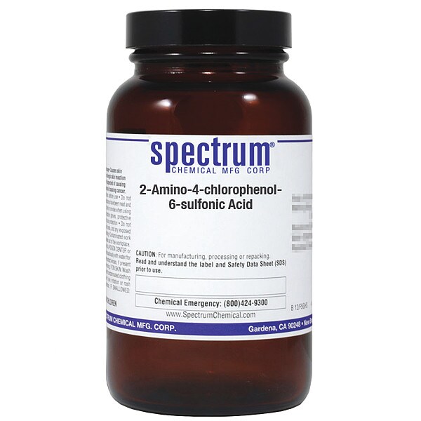 2-Amino-4-Chlorophenol-6-Sulfonic Acid, Concentration 100 Percent, CAS Number 88-23-3, Molecular Weight 223.63, Chemical Formula C6H6ClNO4S, Chemical Container Material Amber Glass, Chemical Container Type Bottle, Chemical Grade Reagent, Chemical Container Size 100 g, Chemical Family Type Acids, Shelf Life 24 mo, Shipping Restrictions UN2811, Toxic Solids, Organic, n.o.s. (2-Amino-4-Chlorophenol-6-Sulfonic Acid), 6.1, PG III