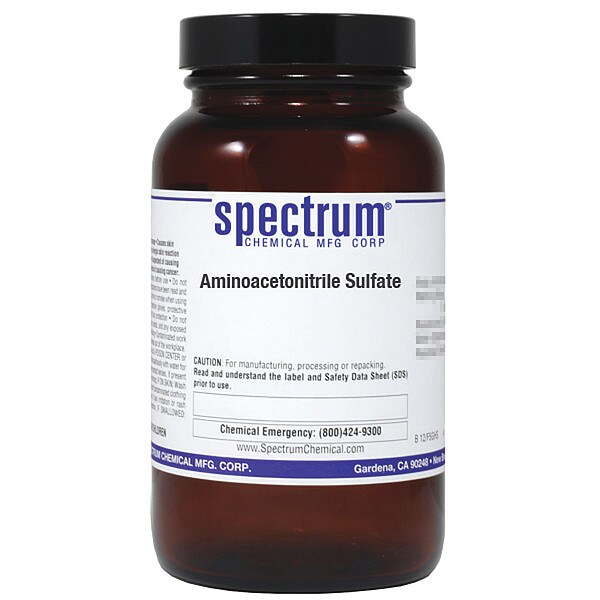 Aminoacetonitrile Sulfate, Concentration 100 Percent, CAS Number 5466-22-8, Molecular Weight 210.21, Chemical Formula C4H8N4.H2SO4, Chemical Container Material Amber Glass, Chemical Container Type Bottle, Chemical Grade Reagent, Chemical Container Size 100 g, Chemical Family Type Acids, Shelf Life 24 mo, Shipping Restrictions UN3439, Nitriles, Toxic, Solid, n.o.s., 6.1, PG III