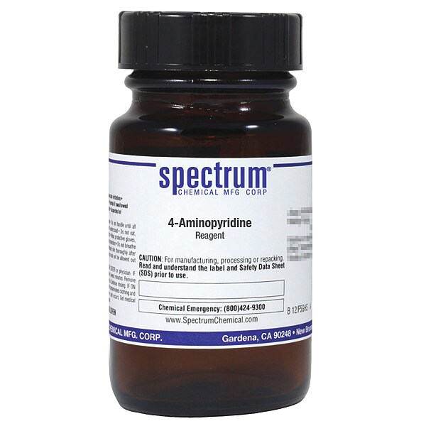 4-Aminopyridine, Concentration 100 Percent, CAS Number 504-24-5, Molecular Weight 94.12, Chemical Formula C5H6N2, Chemical Container Material Amber Glass, Chemical Container Type Bottle, Chemical Grade Reagent, Chemical Container Size 25 g, Chemical Family Type Acids, Shelf Life 24 mo, Shipping Restrictions UN2671, P-Aminopyridine, 6.1, PG II