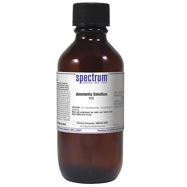 Ammonia Solution, FCC, CAS Number 1336-21-6, Molecular Weight 35.05, Chemical Formula NH4OH, Chemical Container Material Amber Glass, Chemical Container Type Bottle, Chemical Grade FCC, Chemical Container Size 500 mL, Chemical Family Type Bases, Shelf Life 24 mo, Shipping Restrictions UN2672, Ammonia, solution, 8, PG III
