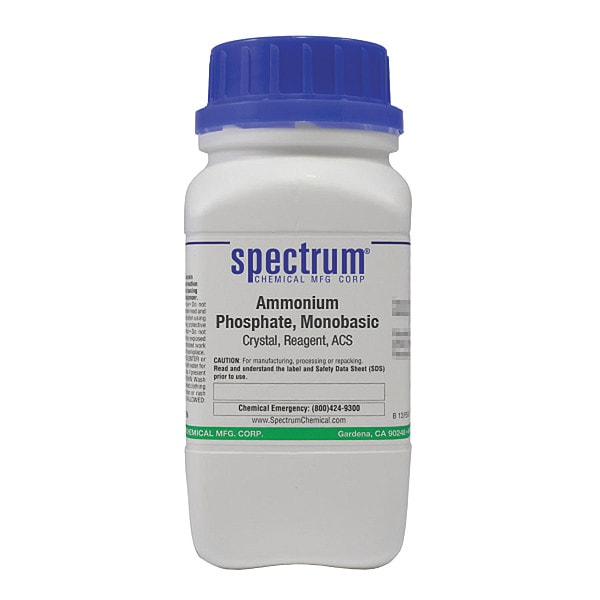 Ammonium Phosphate, Monobasic, Crystal, Reagent, ACS, CAS Number 7722-76-1, Molecular Weight F.W. 115.03, Chemical Formula NH4H2PO4, Chemical Container Material Plastic, Chemical Container Type Bottle, Chemical Grade ACS, Chemical Container Size 500 g, Chemical Family Type Analytical Reagents, Shelf Life 24 mo