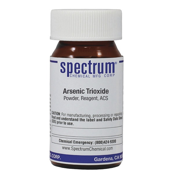 Arsenic Trioxide, Powder, Reagent, ACS, CAS Number 1327-53-3, Molecular Weight 197.84, Chemical Formula As2O3, Chemical Container Material Amber Glass, Chemical Container Type Bottle, Chemical Grade ACS, Chemical Container Size 25 g, Chemical Family Type Analytical Reagents, Shelf Life 24 mo, Shipping Restrictions UN1561, Arsenic Trioxide, 6.1, PG II, Special Information Reductometric Standard Possible Carcinogen