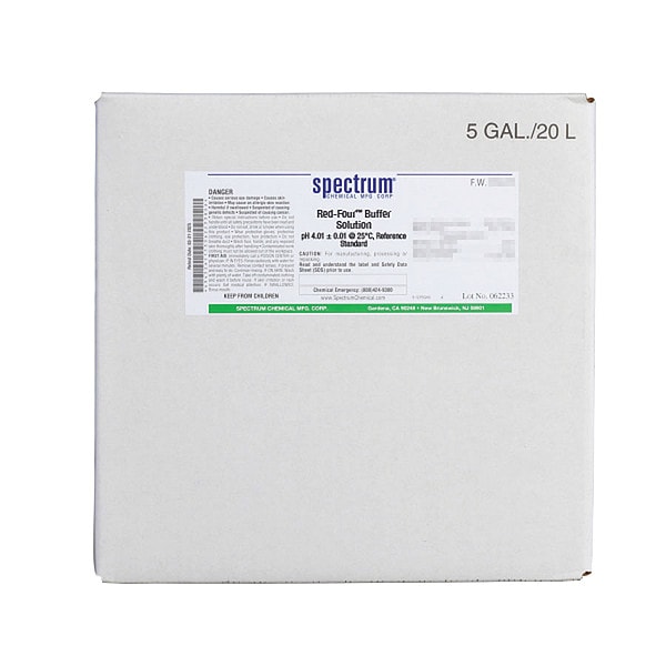 Buffer - Red-Four, Concentration pH 4.01 +/- 0.01 @ 25 Degrees C, CAS Number 7732-18-5, 877-24-7, 915-67-3, 94-13-3, 99-76-3, Molecular Weight 18.02 F.W; 204.22 F.W; 152.15 F.W; 180.20 F.W; 604.46 F.W, Chemical Formula H2O; C8H5KO4; C8H8O3; C10H12O3; C20H11N2Na3O10S3, Chemical Container Material Plastic, Chemical Container Type Drum, Chemical Grade Lab, Chemical Container Size 20 L, Chemical Family Type Buffer, Shelf Life 12 mo, Shipping Restrictions Chemical Not Regulated For Transport