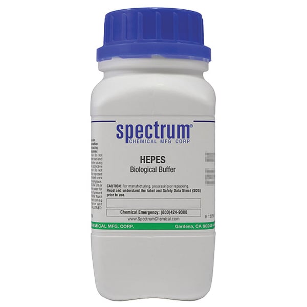 Biological Buffer, HEPES, CAS Number 7365-45-9, Molecular Weight F.W. 238.30, Chemical Formula C8H18O4N2S, Chemical Container Material Plastic, Chemical Container Type Bottle, Chemical Grade Reagent, Chemical Container Size 250 g, Chemical Family Type Standards and Solutions, Shelf Life 24 mo