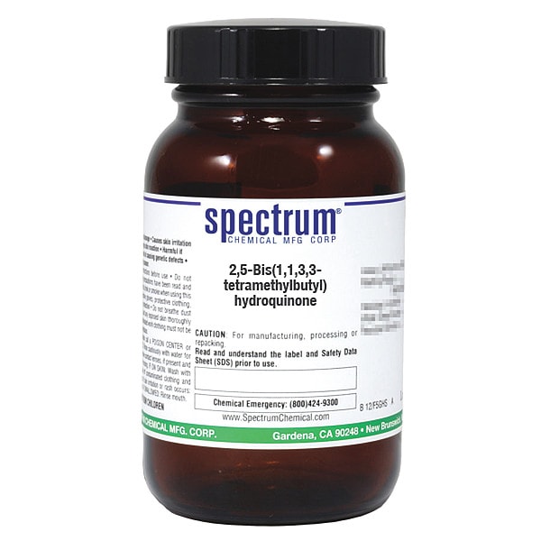 2,5-Bis(1,1,3,3-Tetramethylbutyl)Hydroquinone, Concentration 100 Percent, CAS Number 903-19-5, Molecular Weight 334.54, Chemical Formula C22H38O2, Chemical Container Material Amber Glass, Chemical Container Type Bottle, Chemical Grade Reagent, Chemical Container Size 25 g, Chemical Family Type Acids, Shelf Life 24 mo