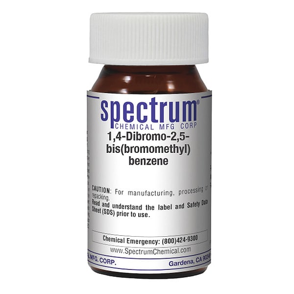 1,4-Dibromo-2,5-Bis(Bromomethyl)Benzene, 97+ Percent, Concentration 100 Percent, CAS Number 35335-16-1, Chemical Container Material Amber Glass, Chemical Container Type Bottle, Chemical Grade Reagent, Chemical Container Size 5 g, Chemical Family Type Acids, Shelf Life 24 mo, Shipping Restrictions UN3261, Corrosive Solid, Acidic, Organic, n.o.s. [1,4-Dibromo-2,5-bis(Bromomethyl)Benzene], 8, PG II