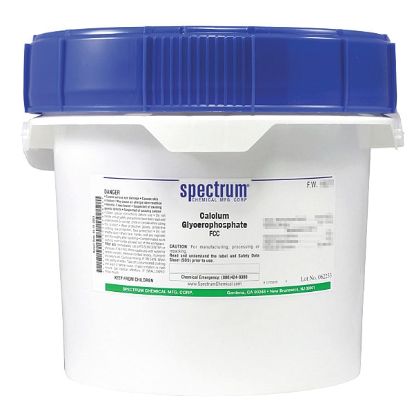 Calcium Glycerophosphate, Concentration Not Applicable, CAS Number 27214-00-2, Molecular Weight 210.14, Chemical Formula C3H7CaO6P, Chemical Container Material Plastic, Chemical Container Type Drum, Chemical Grade FCC, Chemical Container Size 2.5 kg, Chemical Family Type Reagent, Shelf Life 60 mo, Shipping Restrictions Chemical Not Regulated For Transport, Standards Not Applicable, Special Information Not Applicable