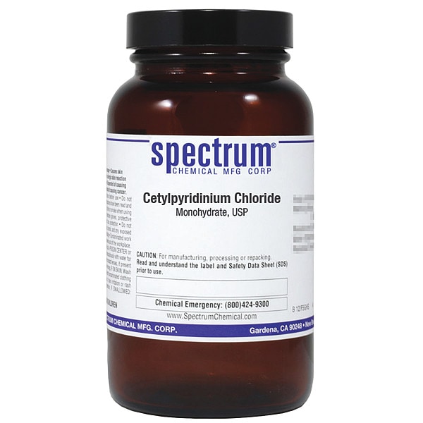 Cetylpyridinium Chloride, Monohydrate, USP, CAS Number 6004-24-6, Molecular Weight 358.00, Chemical Formula C21H38NCl x H2O, Chemical Container Material Amber Glass, Chemical Container Type Bottle, Chemical Grade USP, Chemical Container Size 125 g, Chemical Family Type Analytical Reagents, Shelf Life 24 mo, Shipping Restrictions Chemical Not Regulated For Transport