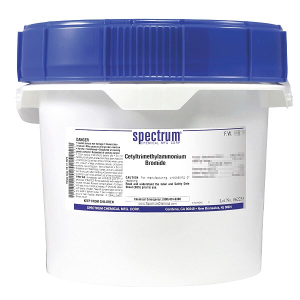 Cetyltrimethylammonium Bromide, Concentration 100 Percent, CAS Number 57-09-0, Molecular Weight 364.46, Chemical Formula C19H42BrN, Chemical Container Material Plastic, Chemical Container Type Drum, Chemical Grade Lab, Chemical Container Size 2.5 kg, Chemical Family Type Reagent, Shelf Life 24 mo, Shipping Restrictions Chemical Not Regulated For Transport, Standards Not Applicable, Special Information Not Applicable