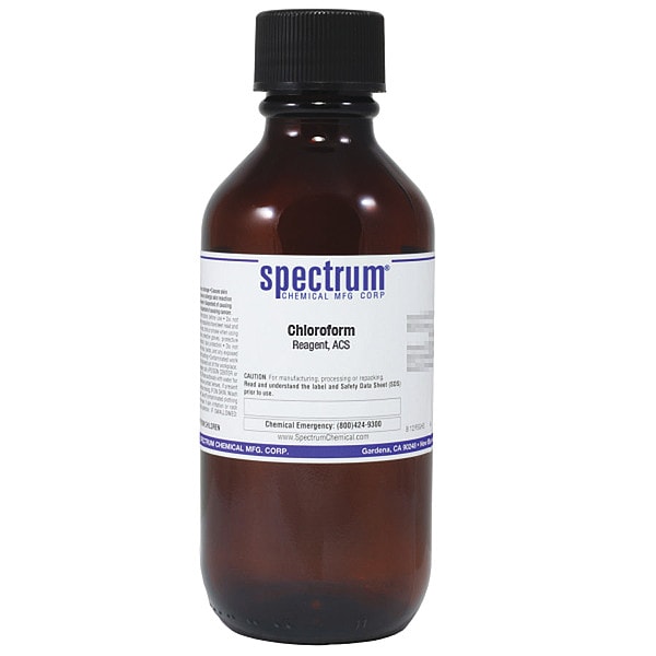 Chloroform - Stabilized, Concentration Not Applicable, CAS Number 67-66-3, Molecular Weight 119.38, Chemical Formula CHCl3, Chemical Container Material Amber Glass, Chemical Container Type Bottle, Chemical Grade ACS, Chemical Container Size 500 mL, Chemical Family Type Solvent, Shelf Life 24 mo, Shipping Restrictions UN1888, Chloroform, 6.1, PG III, Standards Not Applicable, Special Information Not Applicable