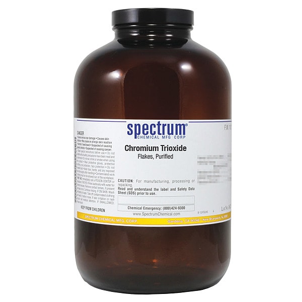 Chromium Trioxide, Concentration Not Applicable, CAS Number 1333-82-0, Molecular Weight 99.99, Chemical Formula CrO3, Chemical Container Material Amber Glass, Chemical Container Type Bottle, Chemical Grade Lab, Chemical Container Size 2.5 kg, Chemical Family Type Reagent, Shelf Life 24 mo, Shipping Restrictions UN1463, Chromium Trioxide, Anhydrous, 5.1 (6.1, 8), PG II, Standards Not Applicable, Special Information Not Applicable
