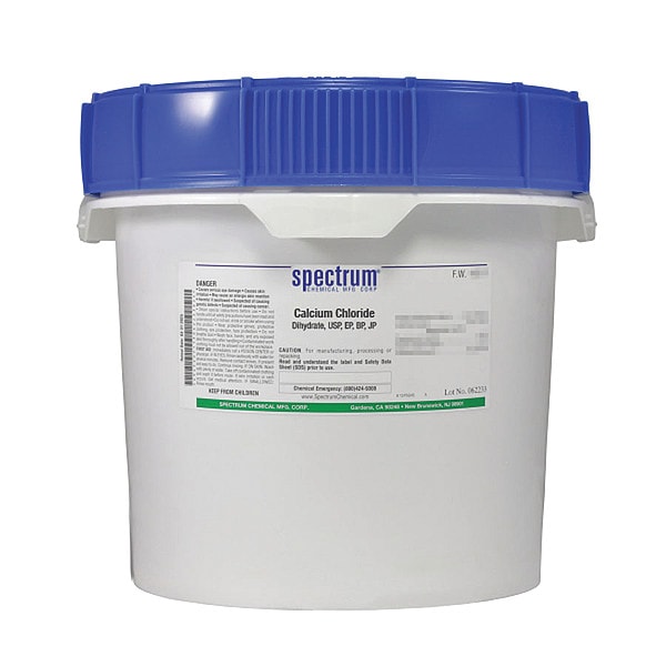 Calcium Chloride - Dihydrate, Concentration Not Applicable, CAS Number 10035-04-8, Molecular Weight 147.01, Chemical Formula CaCl2; 2H2O, Chemical Container Material Plastic, Chemical Container Type Drum, Chemical Grade USP, Chemical Container Size 12 kg, Chemical Family Type Reagent, Shelf Life 60 mo, Shipping Restrictions Chemical Not Regulated For Transport, Standards Not Applicable, Special Information Not Applicable
