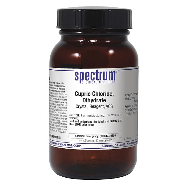 Cupric Chloride - Dihydrate, Concentration Not Applicable, CAS Number 10125-13-0, Molecular Weight 170.48, Chemical Formula CuCl2�2H2O, Chemical Container Material Amber Glass, Chemical Container Type Bottle, Chemical Grade ACS, Chemical Container Size 125 g, Chemical Family Type Reagent, Shelf Life 24 mo, Shipping Restrictions UN2802, Copper Chloride, 8, PG III, Standards Not Applicable, Special Information Not Applicable