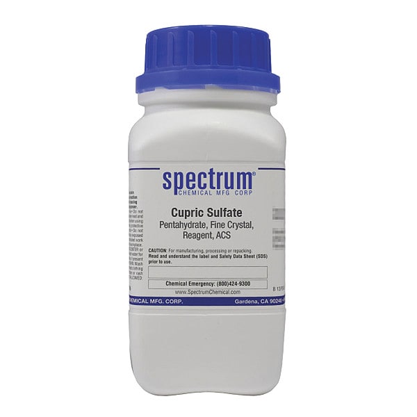 Cupric Sulfate - Pentahydrate, Concentration Not Applicable, CAS Number 7758-99-8, Molecular Weight 249.69, Chemical Formula CuSO; 5H2O, Chemical Container Material Plastic, Chemical Container Type Bottle, Chemical Grade ACS, Chemical Container Size 500 g, Chemical Family Type Reagent, Shelf Life 24 mo, Shipping Restrictions UN3077, Environmentally Hazardous Substance, Solid, n.o.s. (Cupric Sulfate), 9, PG III, Marine Pollutant, Standards Not Applicable, Special Information Not Applicable