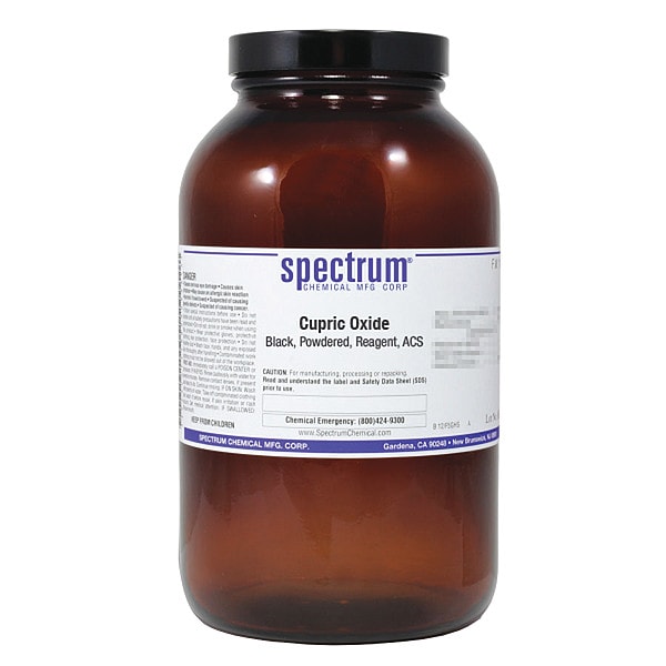 Cupric Oxide, Black, Powdered, Reagent, ACS, CAS Number 1317-38-0, Molecular Weight F.W. 79.55, Chemical Formula CuO, Chemical Container Material Amber Glass, Chemical Container Type Bottle, Chemical Grade ACS, Chemical Container Size 2.5 kg, Chemical Family Type Analytical Reagents, Shelf Life 24 mo