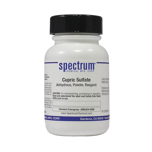 Cupric Sulfate - Anhydrous, Concentration Not Applicable, CAS Number 7758-98-7, Molecular Weight 159.6, Chemical Formula CuSO4, Chemical Container Material Plastic, Chemical Container Type Bottle, Chemical Grade Lab, Chemical Container Size 25 g, Chemical Family Type Inorganic, Shelf Life 24 mo, Shipping Restrictions UN3077, Environmentally Hazardous Substance, Solid, n.o.s. (Cupric Sulfate), 9, PG III, Marine Pollutant, Standards Not Applicable, Special Information Not Applicable