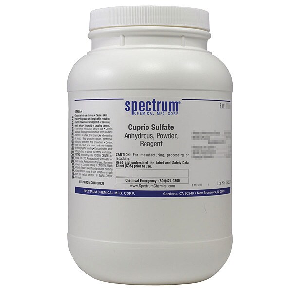 Cupric Sulfate - Anhydrous, Concentration Not Applicable, CAS Number 7758-98-7, Molecular Weight 159.6, Chemical Formula CuSO4, Chemical Container Material Plastic, Chemical Container Type Bottle, Chemical Grade Lab, Chemical Container Size 2.5 kg, Chemical Family Type Inorganic, Shelf Life 24 mo, Shipping Restrictions UN3077, Environmentally Hazardous Substance, Solid, n.o.s. (Cupric Sulfate), 9, PG III, Marine Pollutant, Standards Not Applicable, Special Information Not Applicable