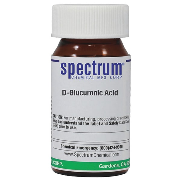 D-Glucuronic Acid, Concentration 100 Percent, CAS Number 6556-12-3, Molecular Weight 194.14, Chemical Formula C6H10O7, Chemical Container Material Amber Glass, Chemical Container Type Bottle, Chemical Grade Reagent, Chemical Container Size 5 g, Chemical Family Type Acids, Shelf Life 24 mo