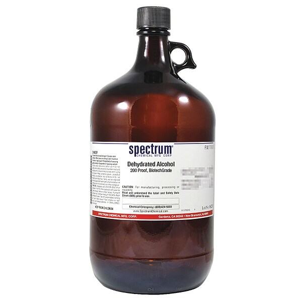 Dehydrated Alcohol, Concentration 200 Proof, CAS Number 64-17-5, Molecular Weight 46.07, Chemical Formula C2H5OH, Chemical Container Material Amber Glass, Chemical Container Type Bottle, Chemical Grade Lab, Chemical Container Size 4 L, Chemical Family Type Alcohol, Shelf Life 24 mo, Shipping Restrictions UN1170, Ethanol, 3, PG II, Standards Not Applicable, Special Information Not Applicable