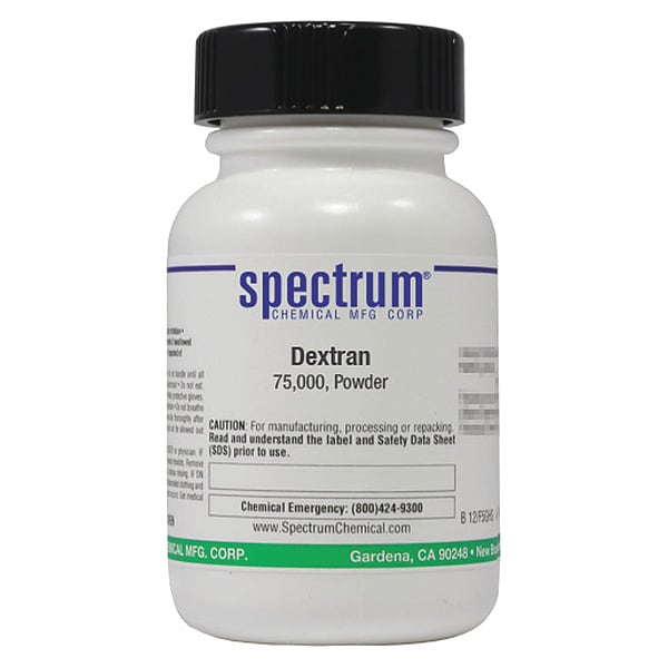 Dextran, 75,000, Powder, CAS Number 9004-54-0, Molecular Weight Av. M.W. 60,000-90,000, Chemical Container Material Plastic, Chemical Container Type Bottle, Chemical Grade Lab, Chemical Container Size 25 g, Chemical Family Type Analytical Reagents, Shelf Life 24 mo, Special Information Glucose polymer produced by the action of the bacteria, Less Thani Greater ThanLeuconostoc mesenteroides Less Thanp Greater Than on a sucrose substrate.