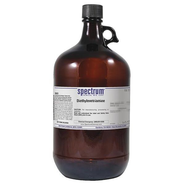 Diethylenetriamine, Concentration 100 Percent, CAS Number 111-40-0, Molecular Weight 103.17, Chemical Formula C4H13N3, Chemical Container Material Amber Glass, Chemical Container Type Bottle, Chemical Grade Reagent, Chemical Container Size 4 L, Chemical Family Type Acids, Shelf Life 24 mo, Shipping Restrictions UN2079, Diethylenetriamine, 8, PG II