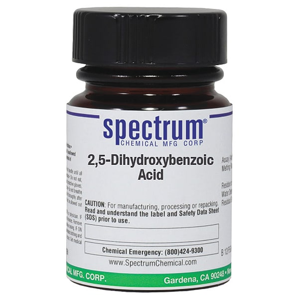 2,5-Dihydroxybenzoic Acid, Concentration 100 Percent, CAS Number 490-79-9, Molecular Weight 154.13, Chemical Formula C7H6O4, Chemical Container Material Amber Glass, Chemical Container Type Bottle, Chemical Grade Reagent, Chemical Container Size 25 g, Chemical Family Type Acids, Shelf Life 24 mo