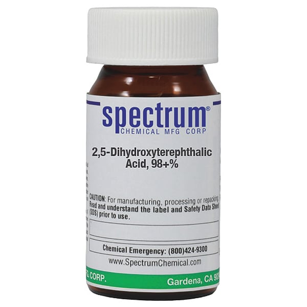 2,5-Dihydroxyterephthalic Acid, 98+ Percent, Concentration 100 Percent, CAS Number 610-92-4, Molecular Weight 198.12, Chemical Formula C8H6O6, Chemical Container Material Amber Glass, Chemical Container Type Bottle, Chemical Grade Reagent, Chemical Container Size 5 g, Chemical Family Type Acids, Shelf Life 24 mo