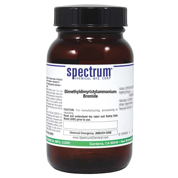 Dimethyldimyristylammonium Bromide, Concentration 100 Percent, CAS Number 68105-02-2, Molecular Weight 518.75, Chemical Formula C30H64BrN, Chemical Container Material Amber Glass, Chemical Container Type Bottle, Chemical Grade Reagent, Chemical Container Size 25 g, Chemical Family Type Bases, Shelf Life 24 mo
