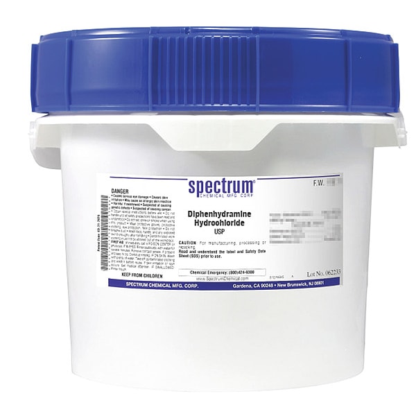 Diphenhydramine Hydrochloride, USP, CAS Number 147-24-0, Molecular Weight F.W. 291.82, Chemical Formula C17H21NO�HCl, Chemical Container Material Plastic, Chemical Container Type Drum, Chemical Grade USP, Chemical Container Size 2.5 kg, Chemical Family Type Analytical Reagents, Shelf Life 24 mo