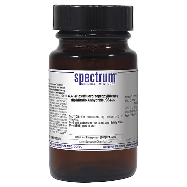 4,4'-(Hexafluoroisopropylidene)Diphthalic Anhydride, 98+ Percent, Concentration 100 Percent, CAS Number 1107-00-2, Molecular Weight 444.24, Chemical Formula C19H6F6O6, Chemical Container Material Amber Glass, Chemical Container Type Bottle, Chemical Grade Reagent, Chemical Container Size 25 g, Chemical Family Type Acids, Shelf Life 24 mo, Shipping Restrictions UN3261, Corrosive Solid, Acidic, Organic, n.o.s. [4,4'-(Hexafluoroisopropylidene)Diphthalic Anhydride], 8, PG II