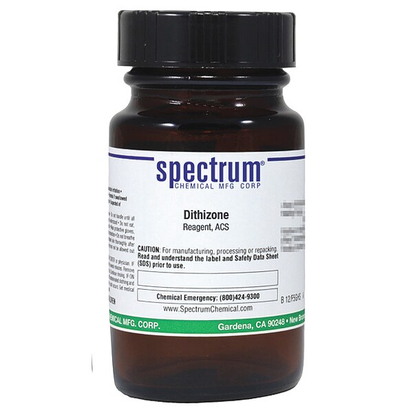 Dithizone, Reagent, ACS, CAS Number 60-10-6, Molecular Weight 256.32, Chemical Formula C6H5NHNHCSN=NC6H5, Chemical Container Material Amber Glass, Chemical Container Type Bottle, Chemical Grade ACS, Chemical Container Size 10 g, Chemical Family Type Analytical Reagents, Shelf Life 24 mo, Shipping Restrictions Chemical Not Regulated For Transport
