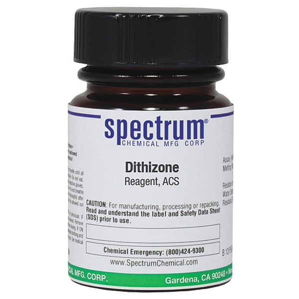 Dithizone, Reagent, ACS, CAS Number 60-10-6, Molecular Weight 256.32, Chemical Formula C6H5NHNHCSN=NC6H5, Chemical Container Material Amber Glass, Chemical Container Type Bottle, Chemical Grade ACS, Chemical Container Size 5 g, Chemical Family Type Analytical Reagents, Shelf Life 24 mo, Shipping Restrictions Chemical Not Regulated For Transport