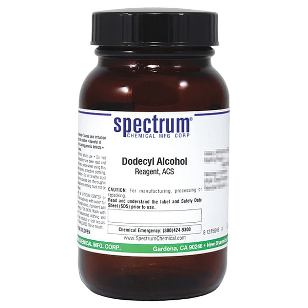 Dodecyl Alcohol, Reagent, ACS, CAS Number 112-53-8, Molecular Weight F.W. 186.34, Chemical Formula CH3(CH2)11OH, Chemical Container Material Amber Glass, Chemical Container Type Bottle, Chemical Grade ACS, Chemical Container Size 100 g, Chemical Family Type Analytical Reagents, Shelf Life 24 mo, Shipping Restrictions UN3077, Environmentally hazardous substance, solid , n.o.s. (dodecyl alcohol), 9, PG III, Marine Pollutant