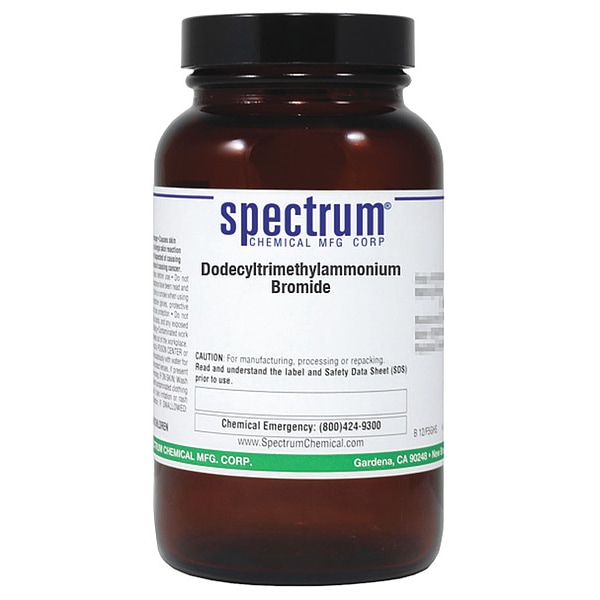 Dodecyltrimethylammonium Bromide, Concentration 100 Percent, CAS Number 1119-94-4, Molecular Weight 308.35, Chemical Formula C15H34NBr, Chemical Container Material Amber Glass, Chemical Container Type Bottle, Chemical Grade Reagent, Chemical Container Size 100 g, Chemical Family Type Bases, Shelf Life 24 mo
