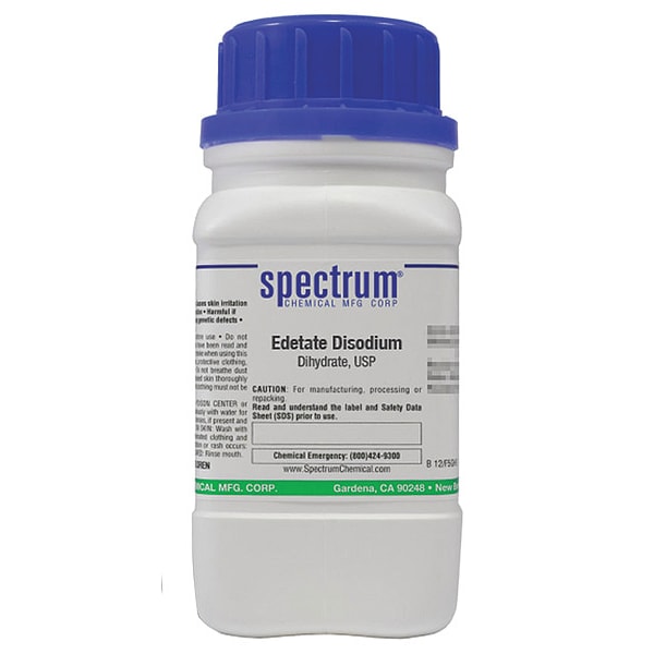 Edetate Disodium, Concentration Not Applicable, CAS Number 6381-92-6, Molecular Weight 336.21, Chemical Formula C10H14N2Na2O8�2H2O, Chemical Container Material Plastic, Chemical Container Type Bottle, Chemical Grade USP, Chemical Container Size 125 g, Chemical Family Type Reagent, Shelf Life 36 mo, Shipping Restrictions Chemical Not Regulated For Transport, Standards Not Applicable, Special Information Not Applicable