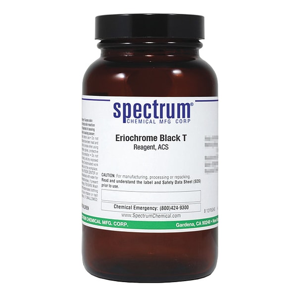 Eriochrome Black T, Concentration Not Applicable, CAS Number 1787-61-7, Molecular Weight 461.38, Chemical Formula C20H12N3NaO7S, Chemical Container Material Amber Glass, Chemical Container Type Bottle, Chemical Grade ACS, Chemical Container Size 100 g, Chemical Family Type Reagent, Shelf Life 24 mo, Shipping Restrictions Chemical Not Regulated For Transport, Standards Not Applicable, Special Information Not Applicable