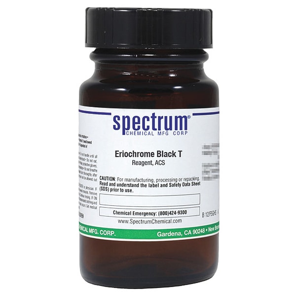 Eriochrome Black T, Reagent, ACS, CAS Number 1787-61-7, Molecular Weight F.W. 461.38, Chemical Formula C20H12N3NaO7S, Chemical Container Material Amber Glass, Chemical Container Type Bottle, Chemical Grade ACS, Chemical Container Size 25 g, Chemical Family Type Analytical Reagents, Shelf Life 24 mo