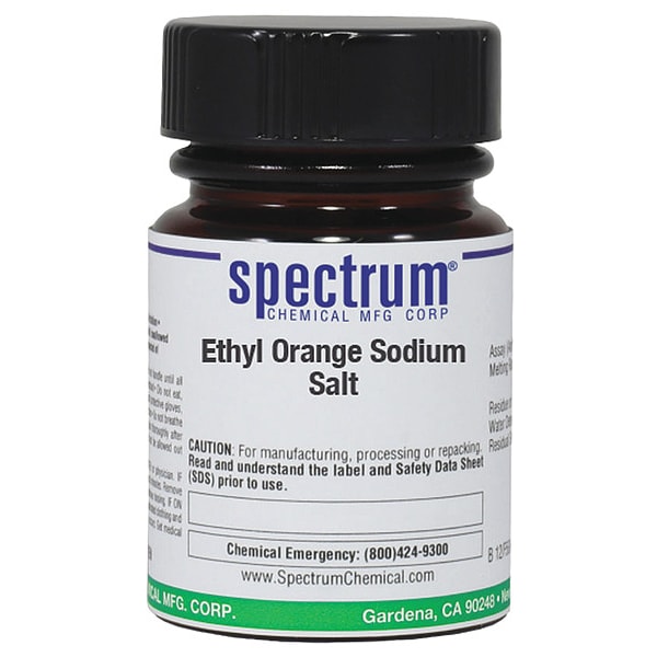 Ethyl Orange Sodium Salt, Concentration 100 Percent, CAS Number 62758-12-7, Molecular Weight F.W. 355.39, Chemical Formula C16H18N3NaO3S, Chemical Container Material Amber Glass, Chemical Container Type Bottle, Chemical Grade Reagent, Chemical Container Size 25 g, Chemical Family Type Standards and Solutions, Shelf Life 24 mo